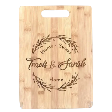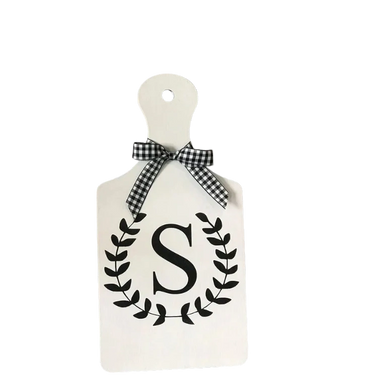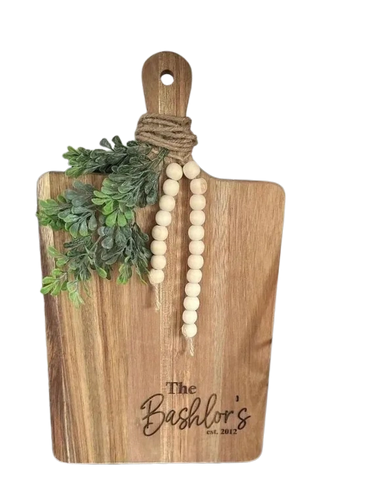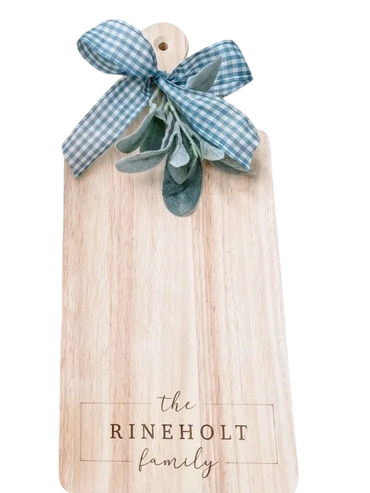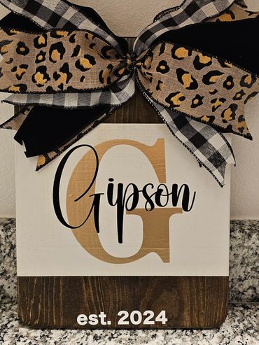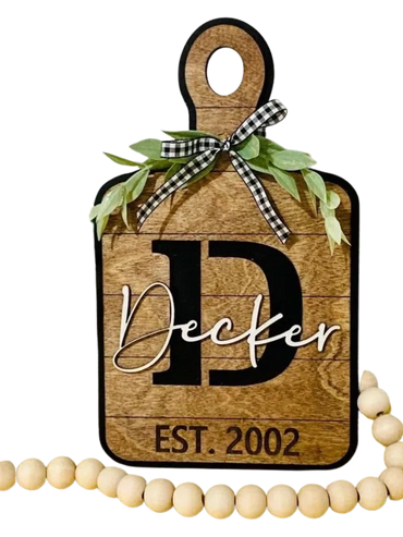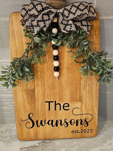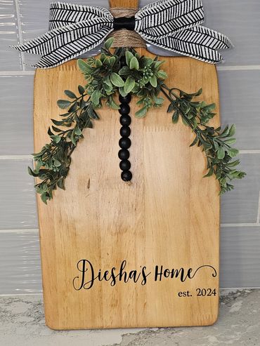 Our cutting boards are made out of different types of wood. They are sanded down to provide a smooth texture for staining and painting. Clients can choose from limitless welcome messages, names or monograms for their cutting boards. These phrases are stenciled, heat pressed, and/or painted on each board. They are properly sealed for indoor use to ensure they last for years to come. Finally, they are adorned with burlap, ribbon, flowers, and more to give it a beautiful and stunning finished look. Each cutting board takes about 4-5 business days to complete as we wait for wood stain, paint, and sealant to dry. Each cutting board is custom and personalized for every client. Below you will find some examples of welcome phrases, names, or monograms that can inspire the perfect cutting board for your door. Just remember, the sky is the limit!